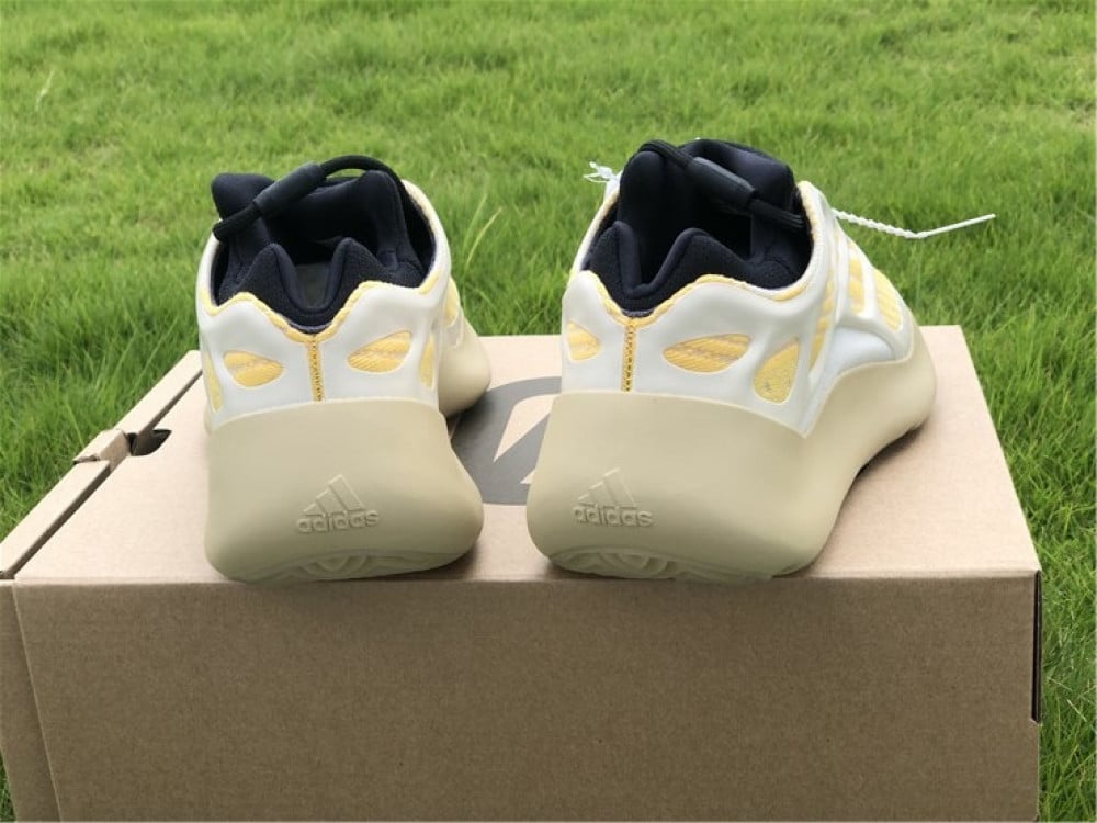 يعرض Adidas Yeezy 700 V3 "Safflower" مخطط ألوان محايد في الغالب يتماشى مع لوحة توقيع علامة Yeezy التجارية. تصل تلميحات دقيقة من اللون عبر خطوط صفراء في جميع أنحاء الجزء العلوي الشبكي المصمم هندسيًا أحادي الشعيرات ، مغطى بقفص RPU يتوهج في الظلام يمتد من الكعب إلى أخمص القدمين تم تصميم الحذاء الداخلي للحذاء الرياضي باللون الأسود المتباين ، مما يوفر مقاسًا مريحًا .